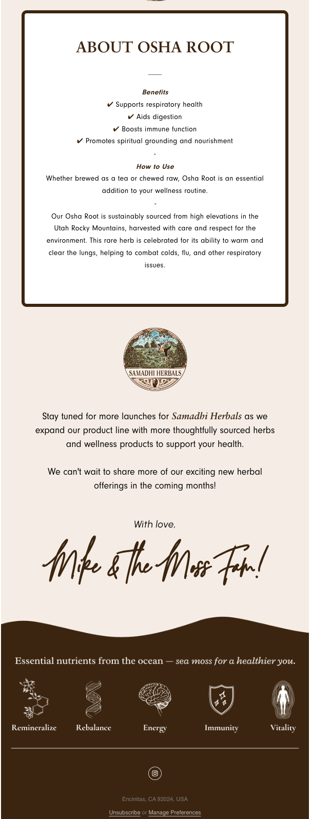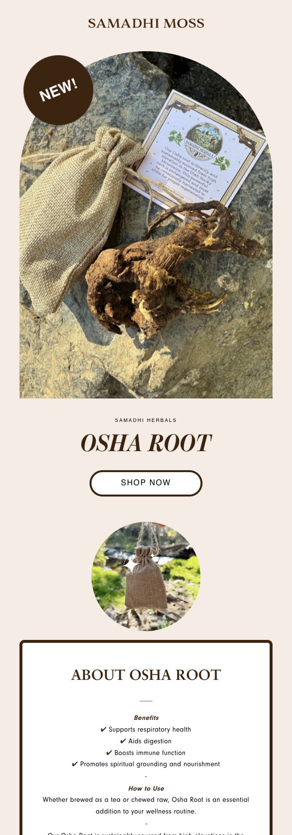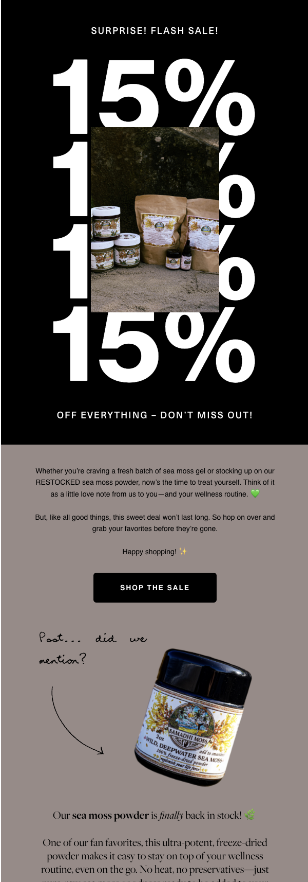 Samadhi Moss is a wellness brand rooted in natural healing, offering sea moss and herbal products designed to support balance and vitality. I’ve worked closely with the founder across multiple phases of the brand’s growth. From its original bohemian aesthetic to a newly reimagined, coastal-inspired identity. My ongoing role includes designing promotional emails, product pages, and digital graphics, as well as managing Shopify inventory. Whether building out collections or redesigning email templates to reflect a brand shift, I’ve helped maintain consistency, clarity, and intention through every stage of Samadhi’s evolution.